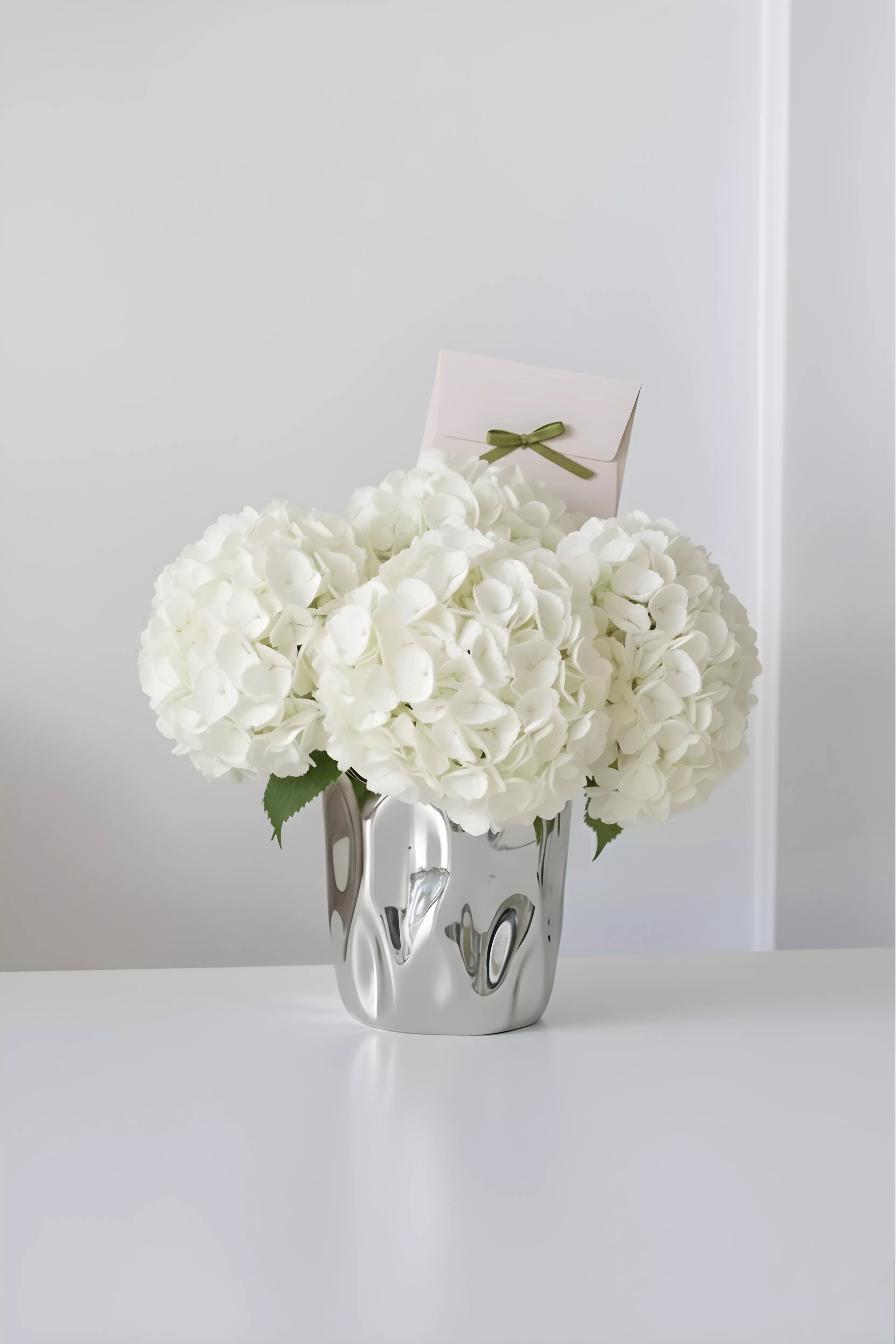 A cloud-like cluster of pristine white hydrangeas, offering pure, timeless beauty in every petal.