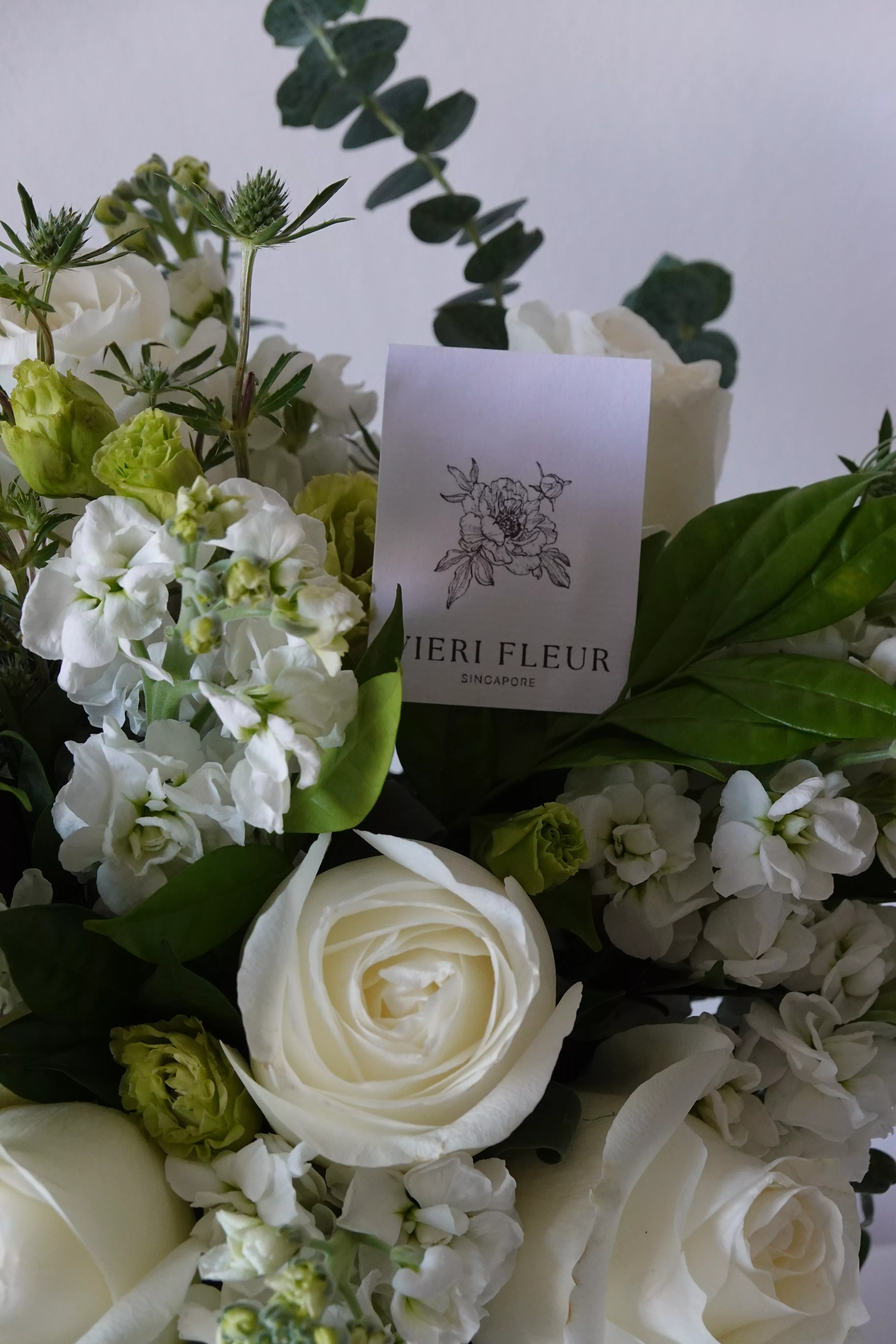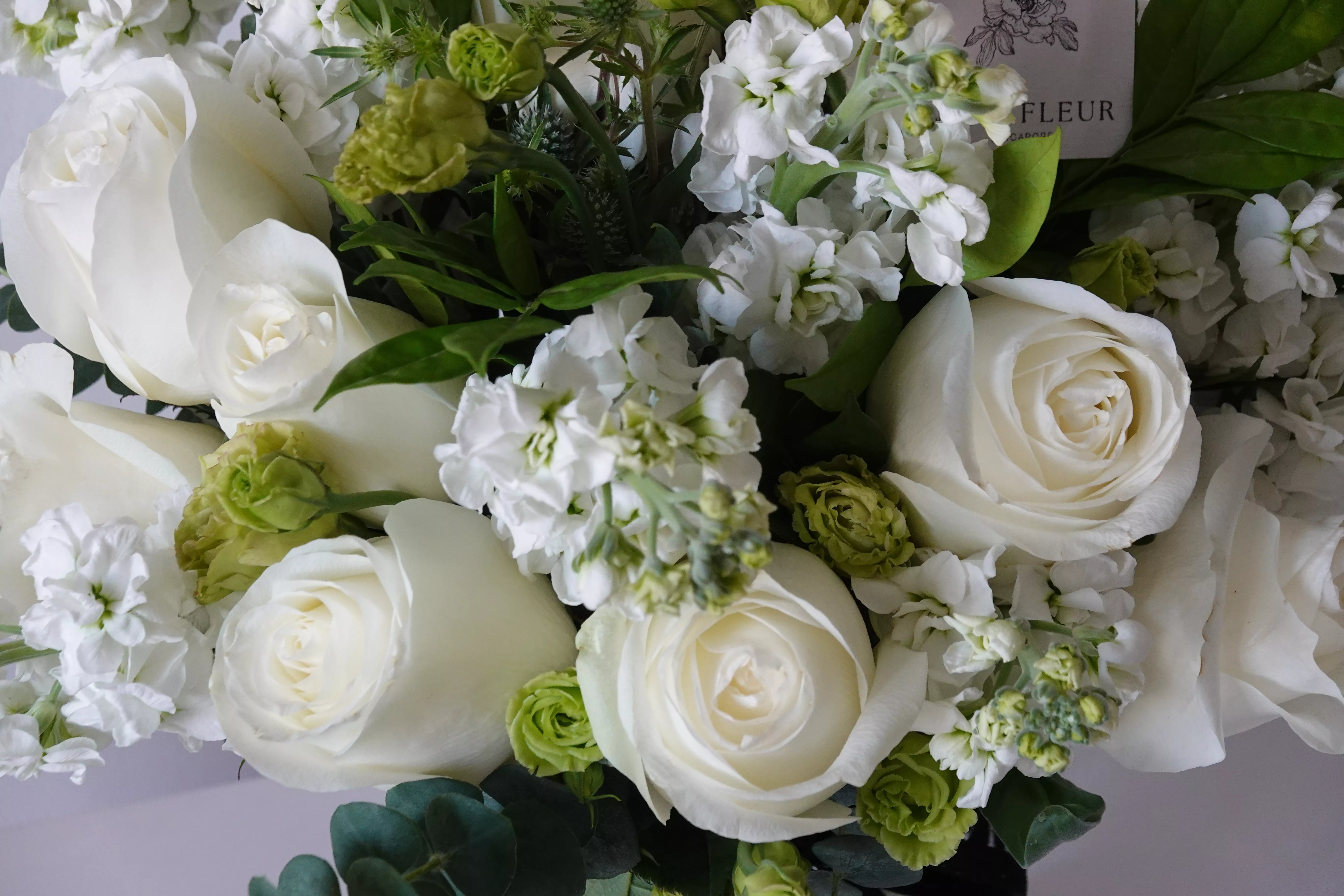 An elegant French bouquet of white flowers, accented with soft greenery for timeless sophistication.