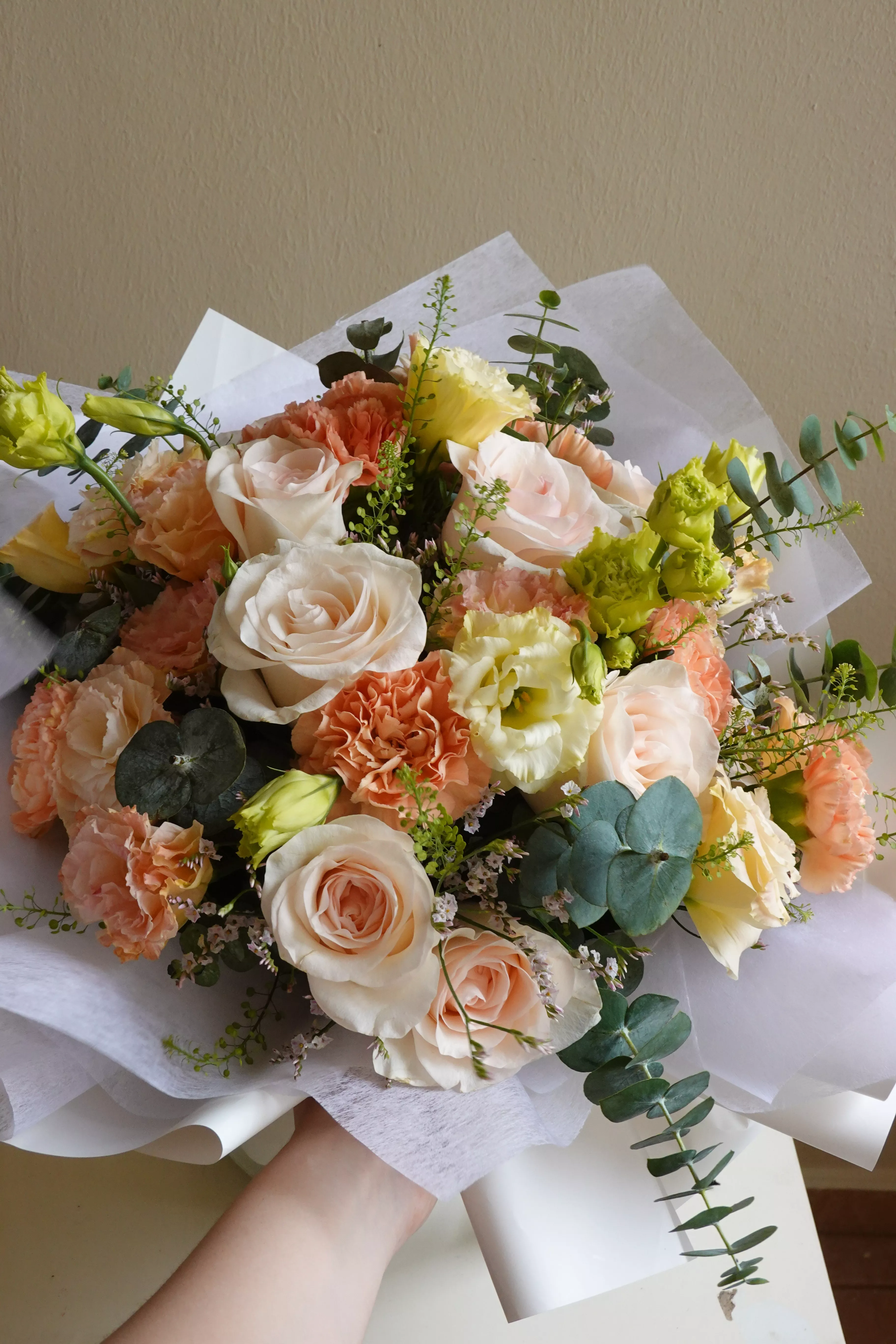 A romantic bouquet of champagne blooms, styled with warm tones for an elegant look depicting the sunset.